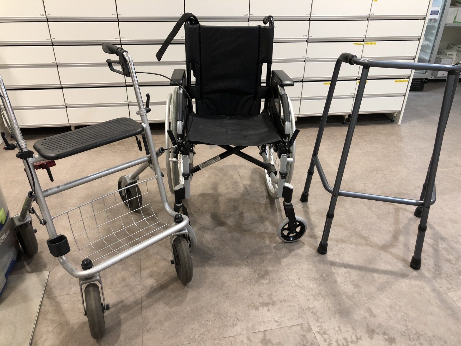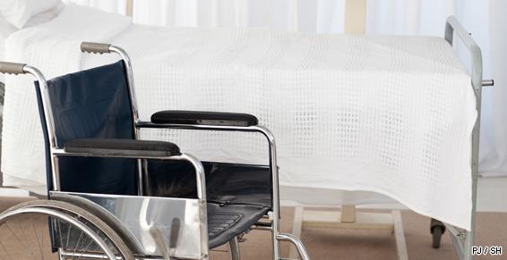 Une chambre, un fauteil roulant, du matériel pour la réadaptation
